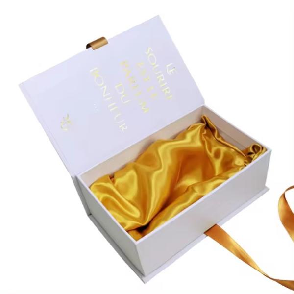 3.Fashion design: all book shape ribbon closure hard cardboard custom logo soft white paper boxes cosmetic perfume packaging gift box with satin are fashion, modern, elegance, good-looking